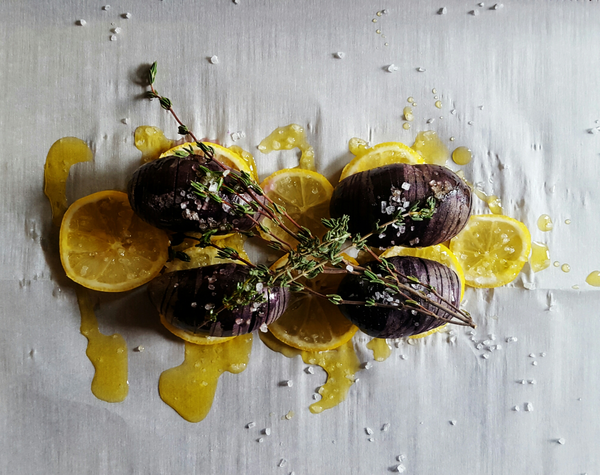Next, slice lemons into circles about a half inch thick. Place the lemons on parchment paper on a cookie sheet and add the potatoes on top of the lemons, drizzle the lemons and the potatoes with olive oil generously, season with the Mediterranean Sea salt and top with thyme sprigs.