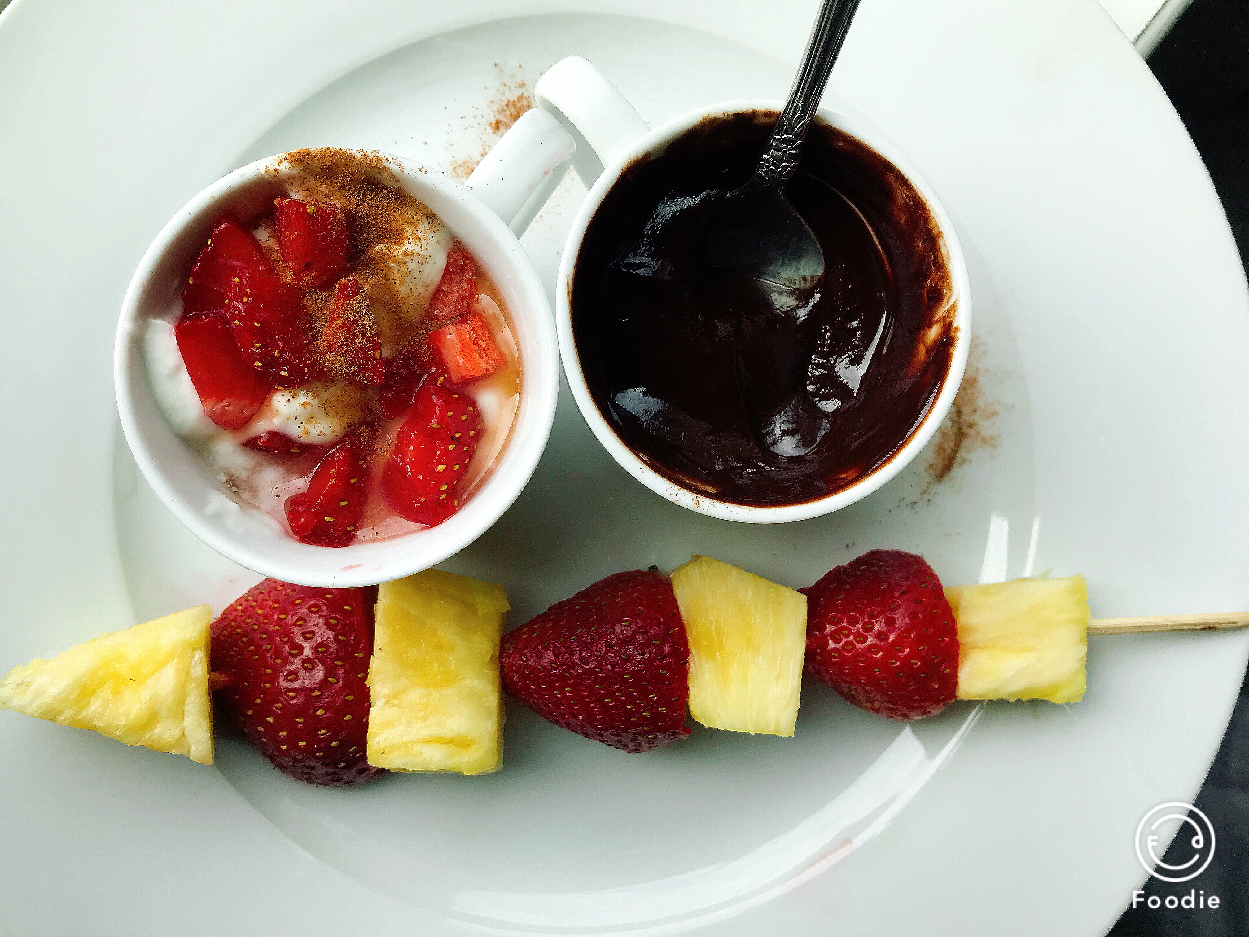 Open up a container of plain yogurt. Chop up pieces of their favorite fruit. Add the fruit and yogurt in a bowl, drizzle with honey or maple syrup and a pinch of cinnamon. Stir and let the kids spoon some over their fruit skewer.