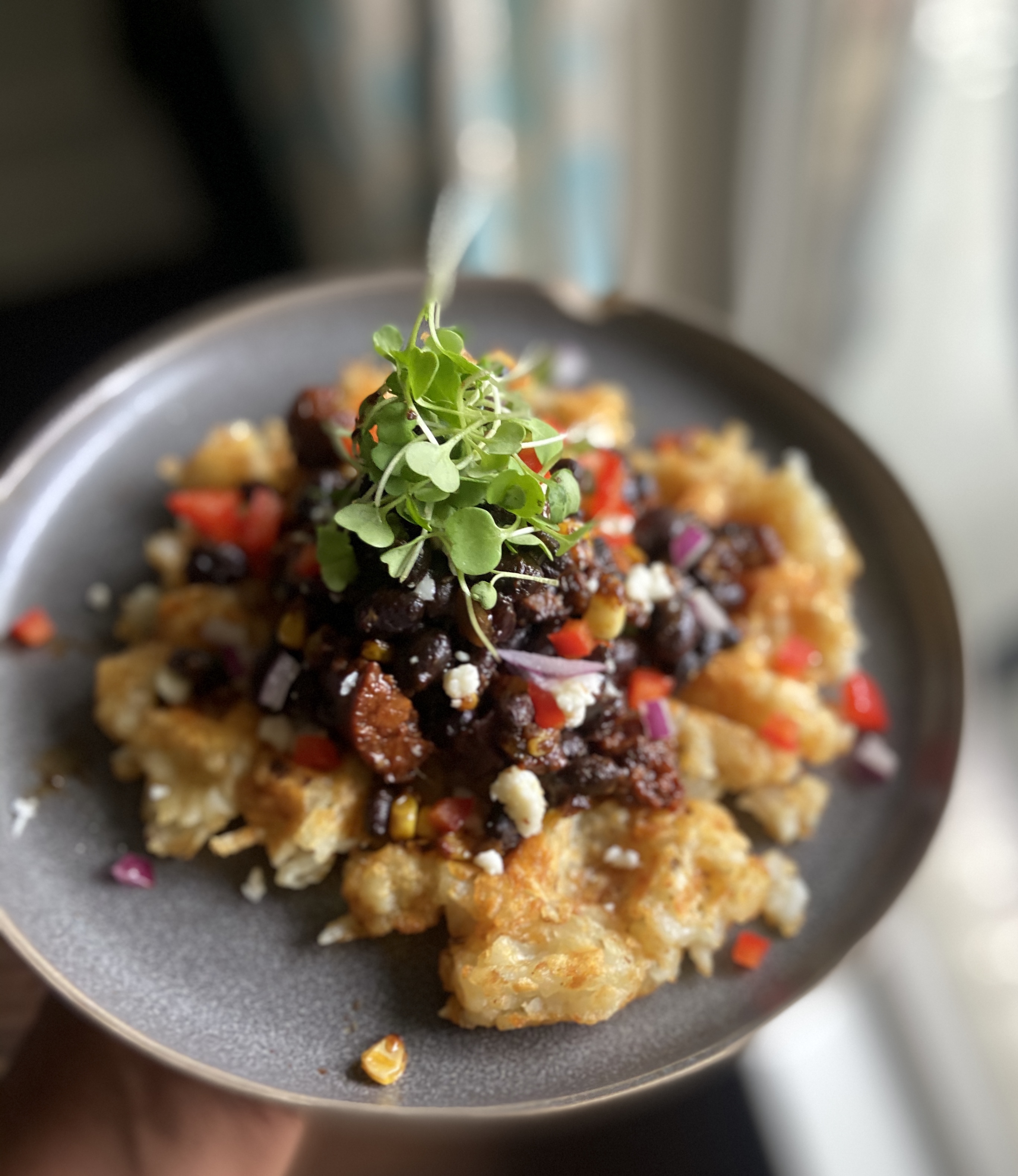 Having grandkids in the house takes my imagination to new and fun levels and it gets conveyed in my food as well. One of the foods my grandkids love is tater tots. They are not a regular in the house, but I do give in occasionally. So tonight I decided, let’s do something fun with these tater tots. Let’s make them into waffles. This recipe is super easy and you can allow your imagination to run wild with the toppings. Tonight I went with a Mexican version; black beans, Mexican vegan sausage, fresh corn , peppers, red onions and fresco, etc. etc.