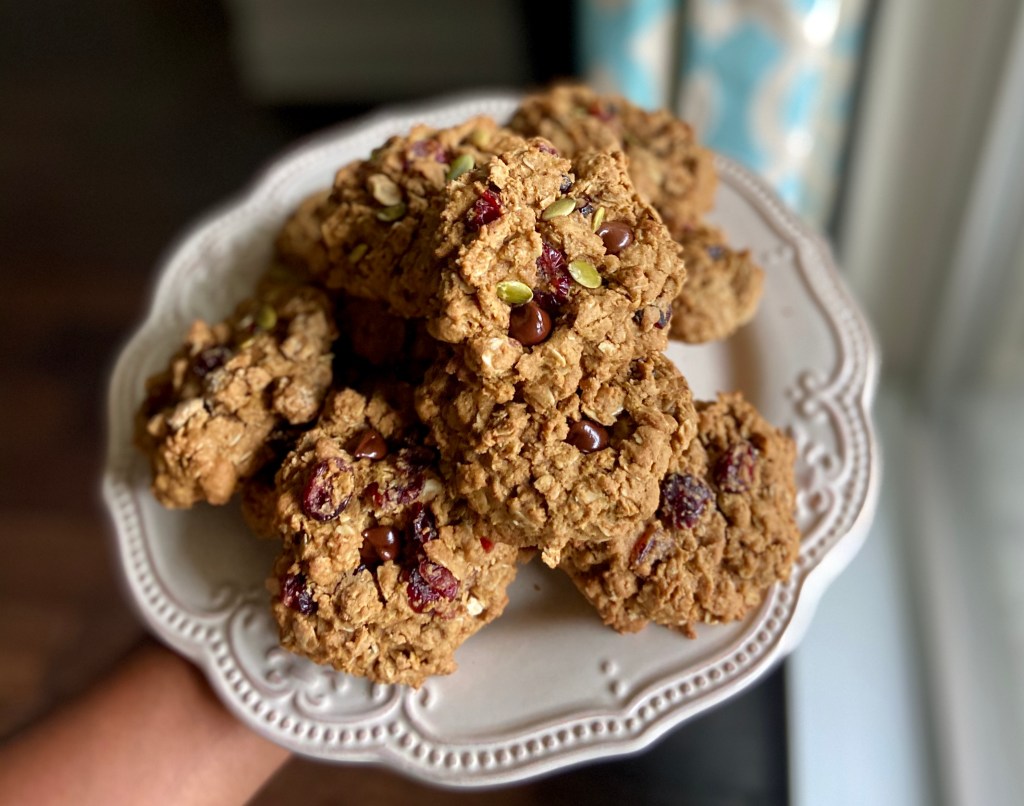 In a large bowl, beat the butter and oil with a handheld electric mixer on medium to high speed for 30 seconds. Add the Sugar, baking soda, spices, and salt. Beat until combined, scraping the sides of the bowl. Beat in the eggs and vanilla extract. Beat in flour and add in the oats. Stir in chocolate chips, cranberries and pumpkin seeds.
