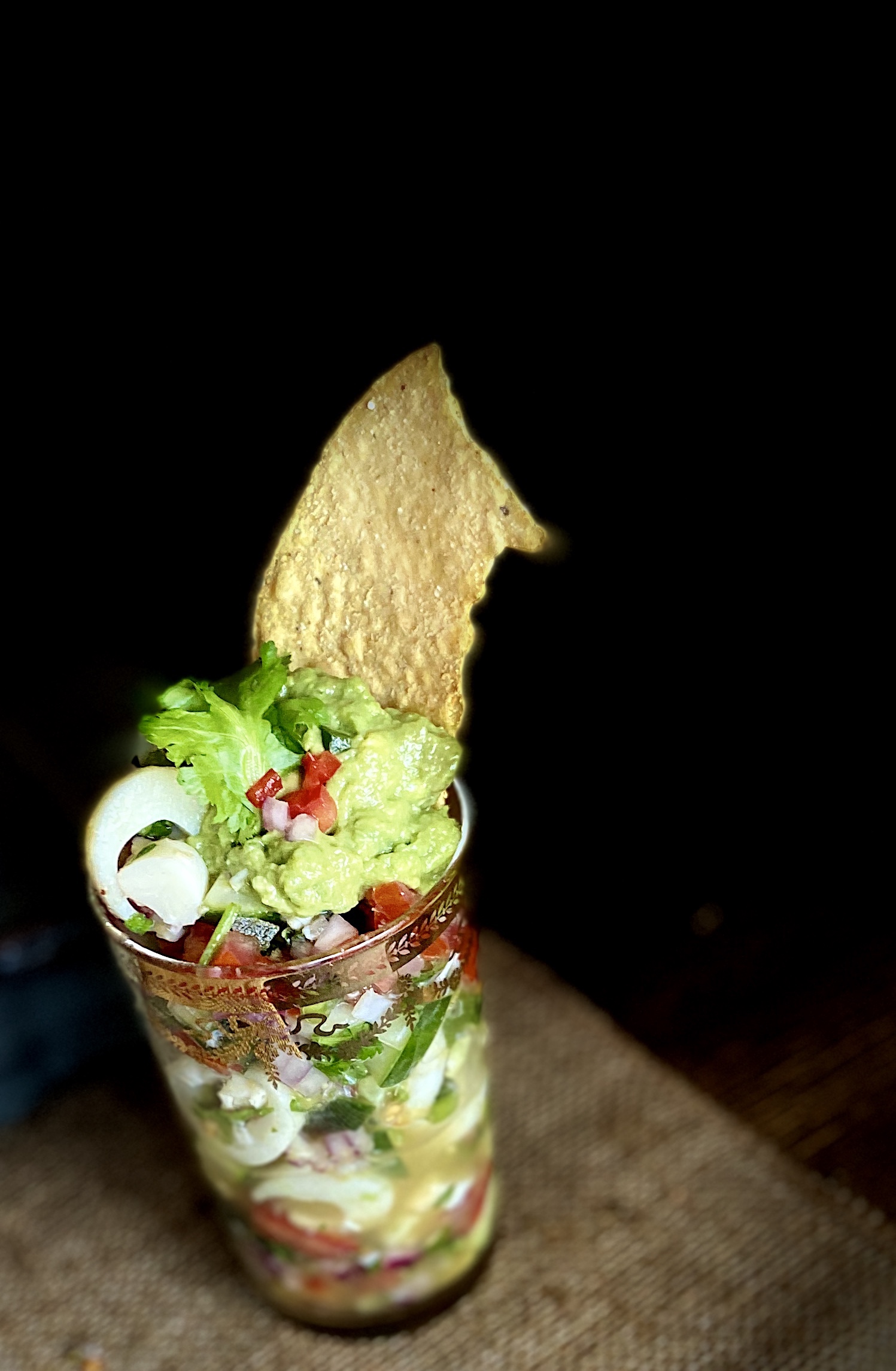 - Deseed the avocados and slice them into large chunks. Stir the avocado into the hearts of palm ceviche or you can make guacamole and add it on top, (photo below). Add the ceviche in a beautiful margarita glass or one of your favorite glasses or bowl, garnish with cilantro leaves and tortilla chips. You can also eat it as a salad.