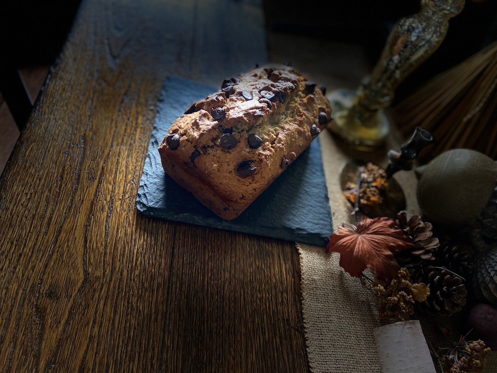 • Add in the chocolate chips and pour the batter into a greased loaf pan. Top with additional chocolate chips.
