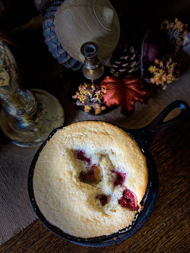 One of my favorite things to do with my grandkids, during fall break, is to take them to my girlfriend’s organic vegetarian farm www.fryfarm.com, just a few miles from my house. The grandkids love to play with her farm dog Remi. He this cute little dachshund that protects the farm from all of the rodents. We all love Remi and he keeps things in tip top shape around there. This visit we got to pick Arkansas black apples, peppers, collard greens, mushrooms and of course, figs. Well before I could even think of a recipe for the figs, my grandkids had already eaten half the box, but I got a chance to get out two easy recipes, an Arugula, Arkansas Black Apple and Fig salad with parmesan, drizzled with a fig vinaigrette and of course this easy Fig Skillet Cake!