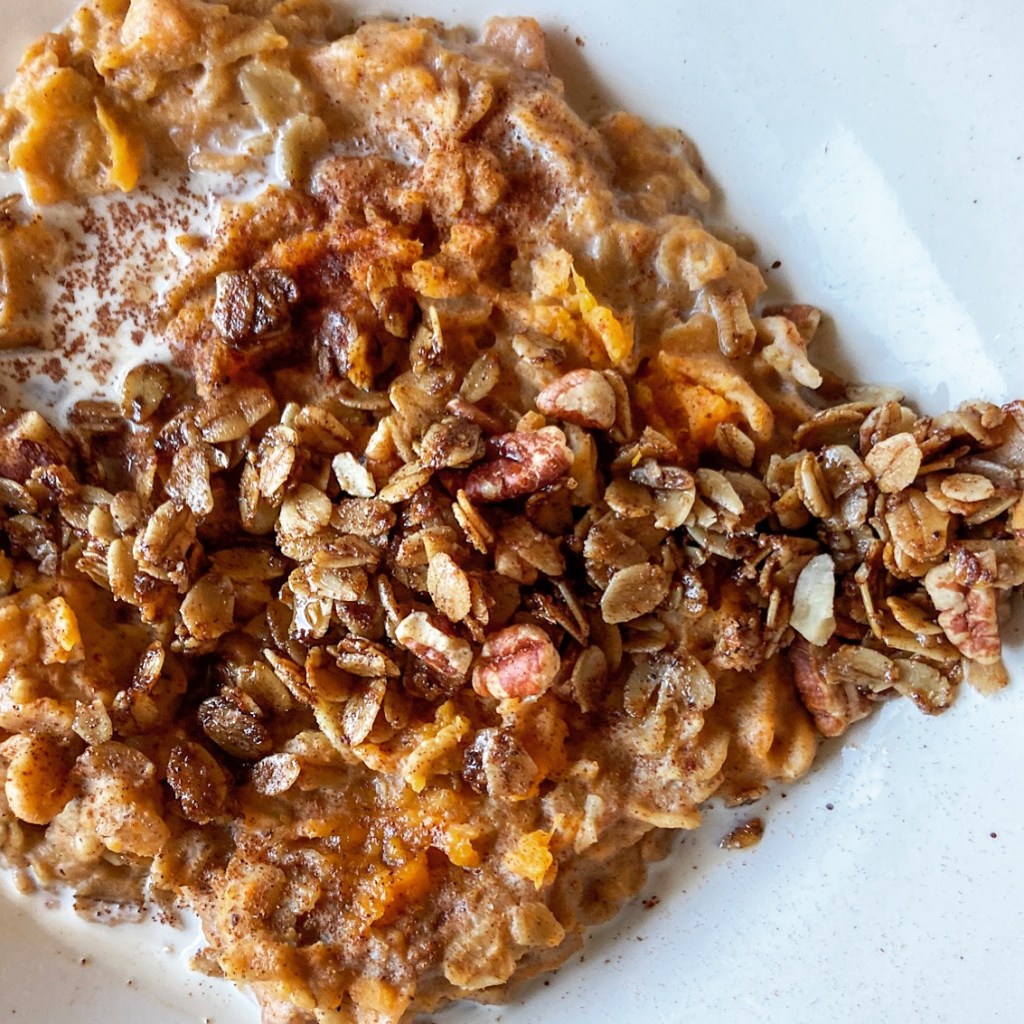 • Bring milk to a boil in a small saucepan. Once boiling add your oats and reduce heat to medium. Once you have cooked the oats for about 5 minutes, stir in the sweet potatoes. Taste and see if you need any more of the spices.