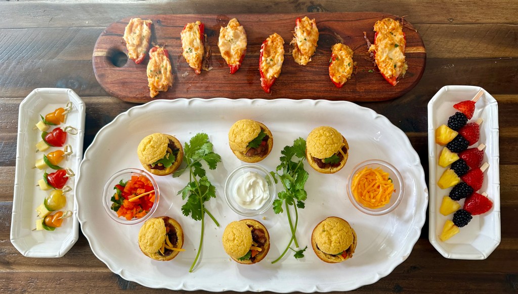 Now for the Cornbread Muffins Stuffed with Chili. This is super simple. Bake the cornbread, and once cooled cut the tops off. Remove the tops and scoop a bit of the cornbread out and add the chili inside. You can add peppers, cheese, and sour cream.