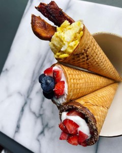 • For a savory cone, fill one waffle cone with scrambled eggs, add a strip of bacon, and a couple of fried plantain slices.