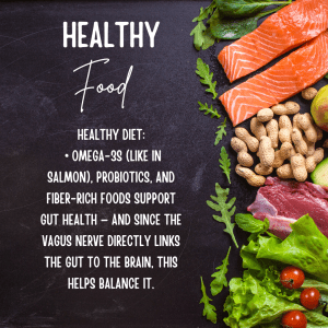 • Omega-3s (like in salmon), probiotics, and fiber-rich foods support gut health — and since the vagus nerve directly links the gut to the brain, this helps balance it.