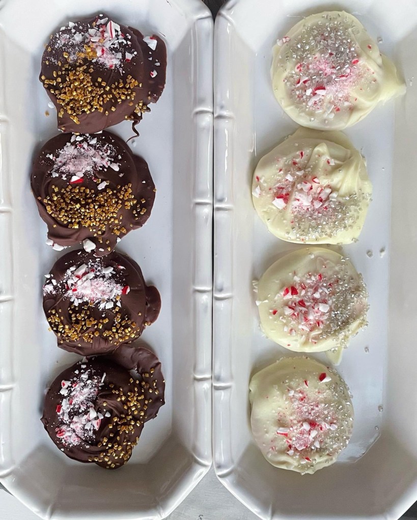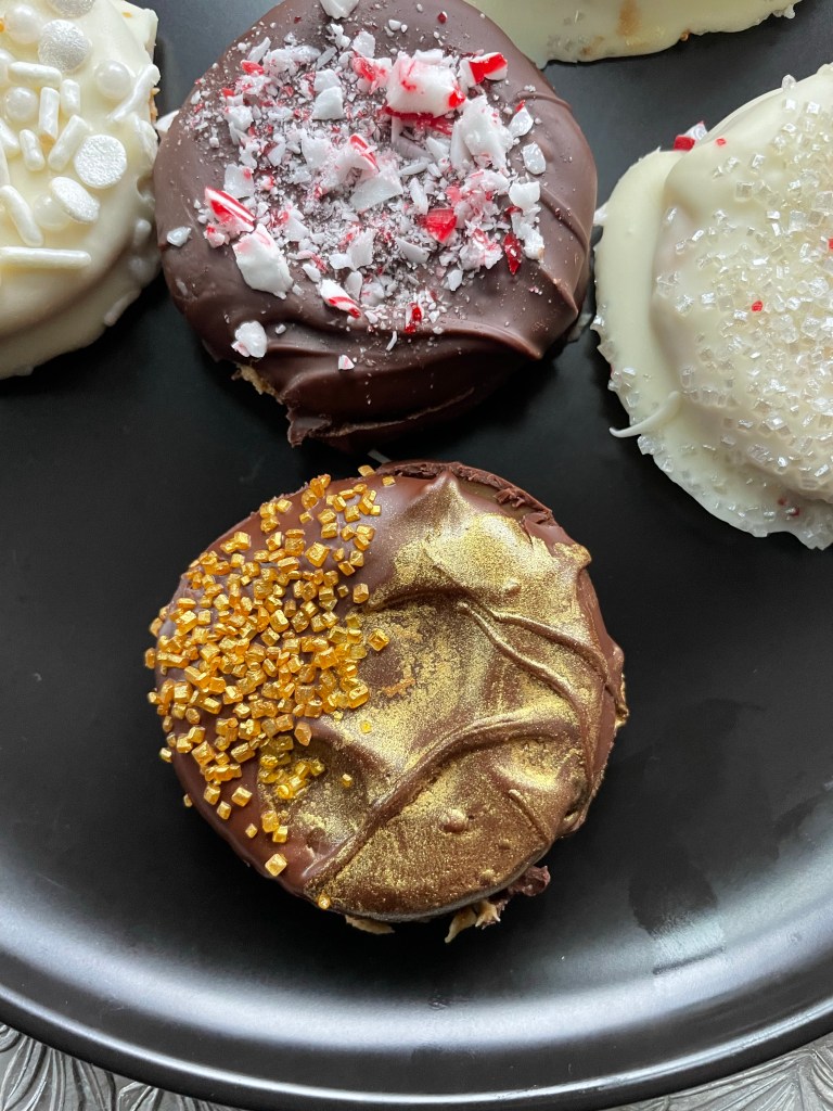 Lots of different kind of sprinkles, crushed peppermint and edible gold spray ( from Kroger or Hobby Lobby)