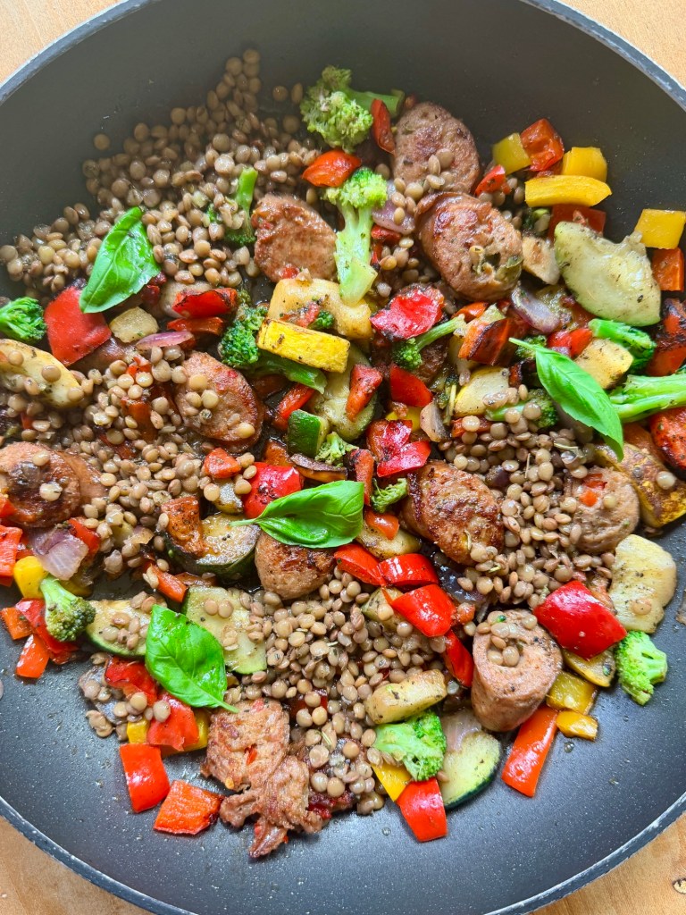 This bowl combines lean protein with fiber-rich vegetables and lentils to keep you full without feeling heavy.
